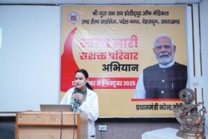 देहरादून। प्रधानमंत्री नरेंद्र मोदी के जन्मदिवस (17 सितम्बर) पर शुरू हुए “स्वस्थ नारीःसशक्त परिवार अभियान” को देहरादून स्थित श्री गुरु राम राय इंस्टीट्यूट ऑफ मेडिकल एंड हेल्थ साइंसेज एवम् श्री महंत इन्दिरेश अस्पताल ने नई गति प्रदान की। महिला स्वास्थ्य को समर्पित इस पहल के तहत अस्पताल के विशेषज्ञों ने स्त्री रोग संबंधी कैंसर पर जनजागरूकता कार्यक्रम आयोजित किया और उपस्थित लोगों को ओवेरियन, यूटरस व सर्विक्स कैंसर के लक्षण, रोकथाम एवं उपचार की जानकारी दी।